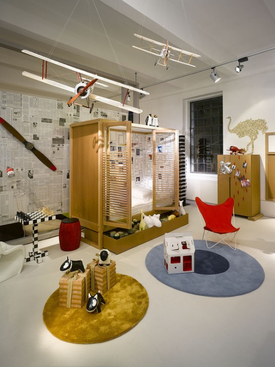 Last but not may be least one of the most adventures looking bedroom for a boy again from Mimolimit. While airplanes are on top of the roof..wall covered with animals and newspaper wall paper have spice up the total look.
