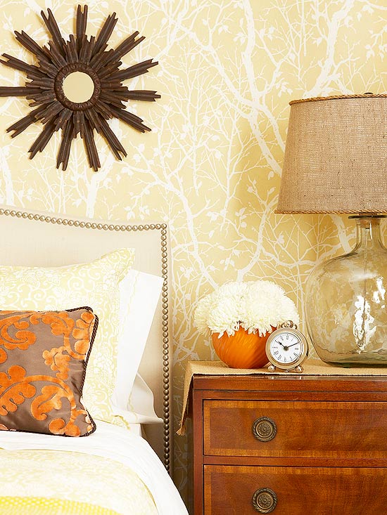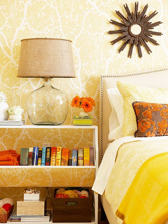 Fabulous color combination of Yellow, Ivory, brown and beige incorporates with different textures, just amazing. Bright yellow jungle effect patterned wall paper has turn the room upside down and same old bedside cupboard has given the color along with all the accent pieces around. What about the clear lamp with the natural color textured shade.