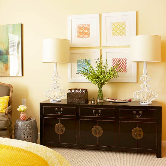 Like Hide and Seek, they have well played with the mix and match furniture game by adding this black Chinese side board attached with some golden handles to go with the yellow golden palette. Again the wall arts have added more texture to the room with graphic designs covered with pleasing white frames. How about the two bird cage lamps, haven’t those complete the total look standing proud?