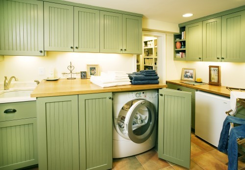 This is high tech green cabinet for washing machine made by LG , which can fit pretty well among your other elements , and can hide the washing machine properly.