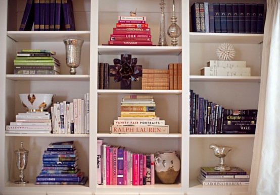 Main purpose of having a bookcase is to keep all the books in order right? Then while keep them in reachable manner, we can make it colorful & can make a statement by arranging them in color group. We can use different colored paper or fabric to cover them up & streamlined accordingly.
