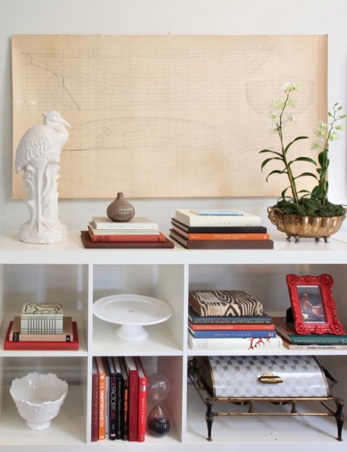 To create a most dramatic impact it is better to arrange and group alike books, objects & accessories together without spreading around. And again may be depend on different heights of the books / pieces can arrange to have a visual interest.